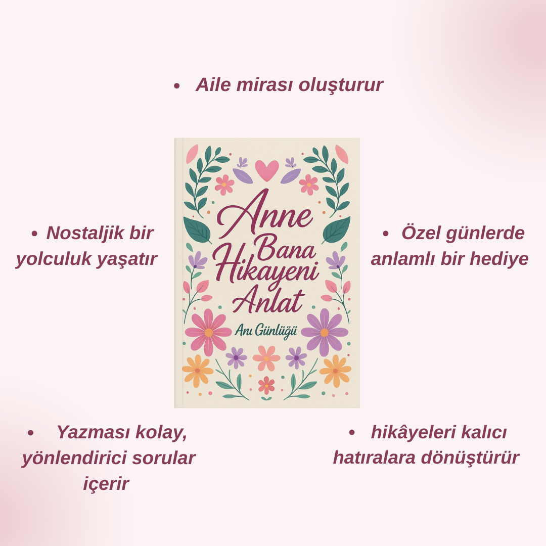 “Anne Bana Hikayeni Anlat”, annenin geçmişini, hayallerini, zorluklarını ve seni büyütürken hissettiklerini kendi el yazısıyla anlatmasını sağlayan duygusal bir anı günlüğüdür.